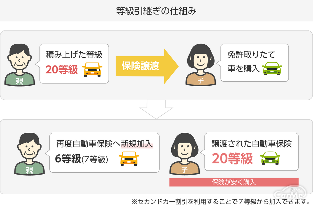 親から子供へ自動車保険に加入するので譲る たとえば、このようなケースは比較的多いでしょう。 45歳父親が自動車保険に加入してから、一度も保険を使ったこともなく「等級」の優良ドライバーだと仮定します。 ただ、子供が自動車保険に加入するのであれば「6等級新規」として契約する3 親の車aは親の名義で任意保険に新規加入する 自分がもう車に乗らないので親族(子ども含む)に等級を譲る場合 1 大きい等級の車a(本人)とそれより小さい等級の車b(親族)で車両入替の申請をす 軽貨物事業を始める時に おそらく一番悩ましいのが 自動車保険だと思います。 ハッキリと言います! 事業用自動車は新規でしか加入できないは嘘です! 一定条件さえ整えば等級引継ぎが出来ます! 事業用自動車保険は取り扱っている 保険会社も少なく だいたい保険加入をしようとす